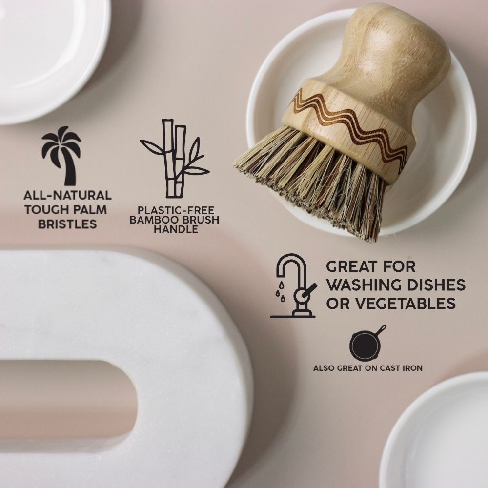 Whether you're scrubbing pots and pans, cleaning vegetables, or tackling surfaces around the house, this bamboo scrub brush is up to the task. Its versatile design, and resilient Palm bristles makes it a must-have for any eco-conscious home.